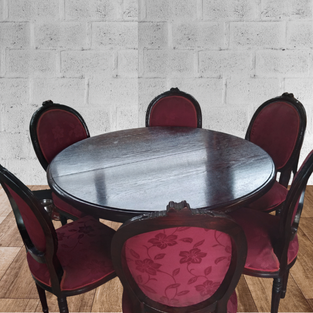 Vendo comedor grande, mesa redonda extensible, pata de piña, con sus 6 sillas tapizadas en asiento y respaldo. Interesados contactar al whatsapp +56969036027