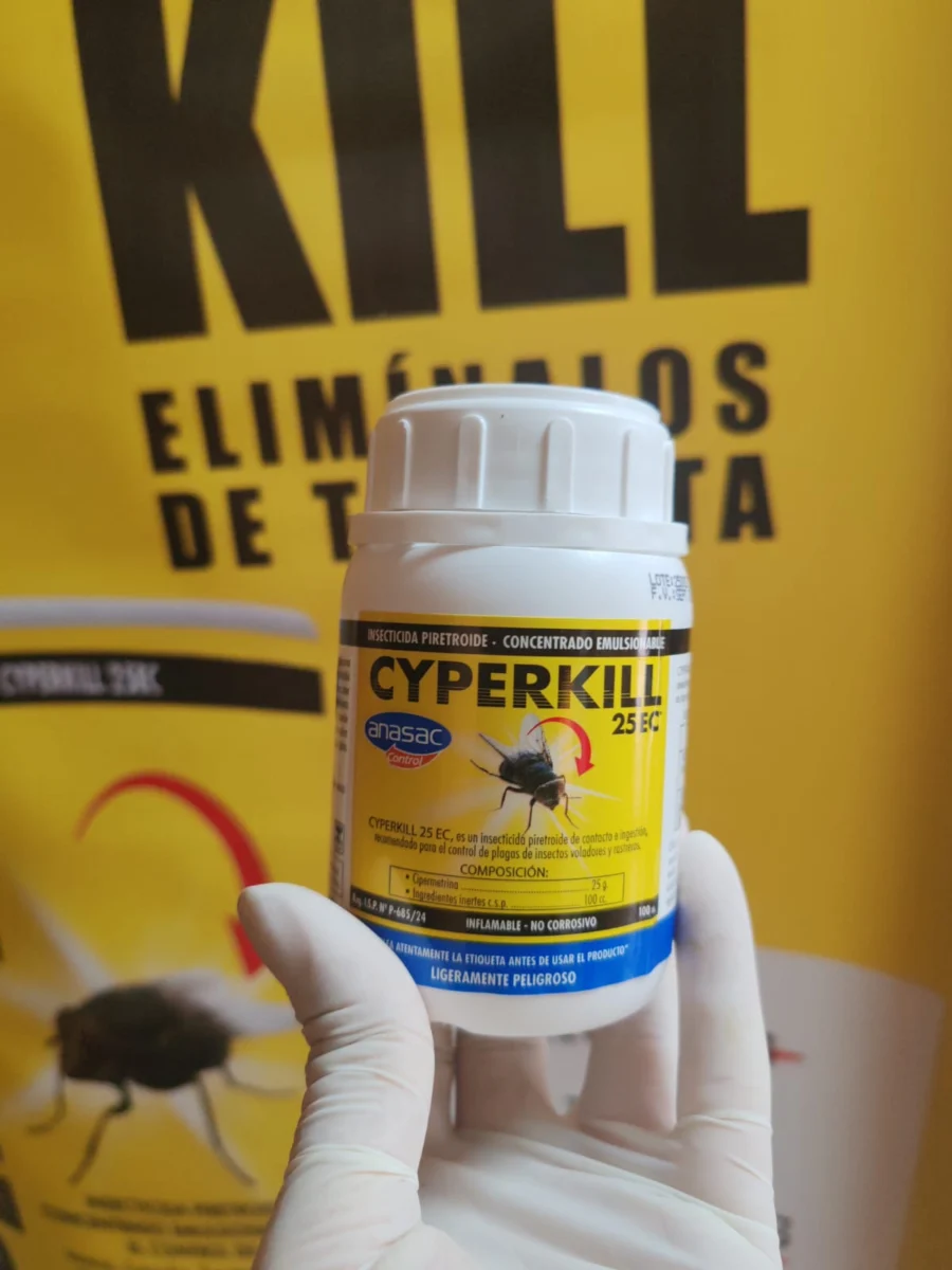 Cyperkill es un insecticida de amplio espectro formulado con cipermetrina, ideal para eliminar y controlar plagas urbanas en hogares, bodegas, locales comerciales y exteriores. Su acción residual garantiza protección por varios días. Controla eficazmente: Arañas Cucarachas Hormigas Pulgas y garrapatas en el ambiente Mosquitos Polillas Insectos rastreros y voladores Beneficios: Acción rápida y de larga duración Fórmula concentrada (rinde mucho más) Ideal para uso doméstico y comercial Efectivo en interiores y exteriores Fácil de diluir y aplicar Modo de uso (general): Diluir segun indicación de la etiqueta Aplicar con pulverizador en superficies afectadas. Mantener a personas y mascotas fuera del área hasta que seque.