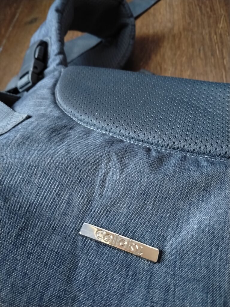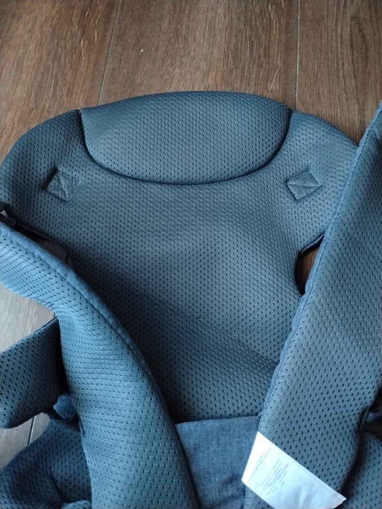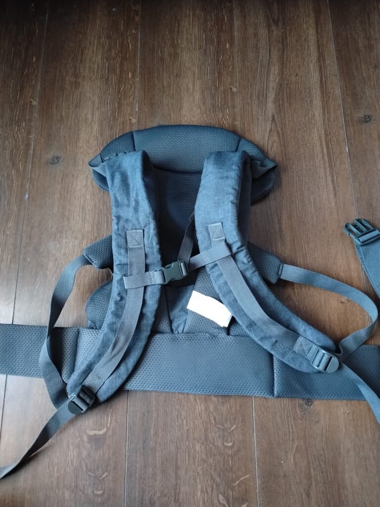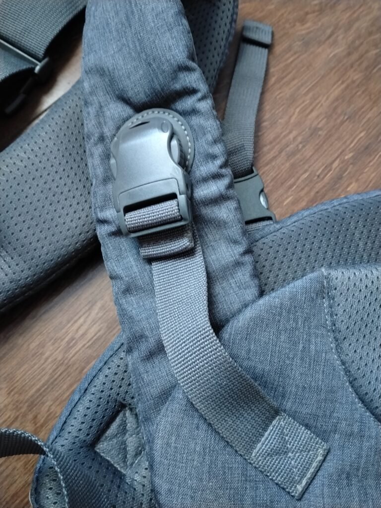 Porta bebé ergonómico estilo mochila con acolchado completo, color gris oscuro.