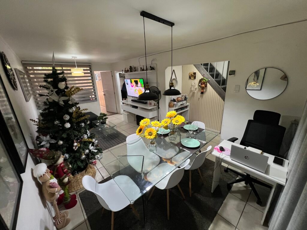 Casa de dos niveles que ofrece una superficie total de 88 m² y útil de 87 m². Al ingresar se encuentra una zona de estar y comedor, que conecta con un espacio de trabajo adaptado, ideal para quienes requieren funcionalidad dentro del hogar. La cocina es independiente y está equipada con muebles superiores e inferiores, cuenta con cocina a gas y espacio para refrigerador, además de detalles prácticos como acceso directo a un área de servicio. La casa posee dos dormitorios distribuidos en la planta superior, junto con dos baños completos, uno de ellos incorporando zona de lavadora. Los espacios privados muestran una distribución eficiente, con closets empotrados y ventanas que permiten entrada de luz natural. El acceso a la planta alta es mediante una escalera con baranda metálica. Como complemento, dispone de una bodega para almacenamiento. La organización del ambiente, acabados y distribución aportan funcionalidad y comodidad en cada espacio. Metro Más Cercano : Hospitales Claudio Clavería 9.9702753.4