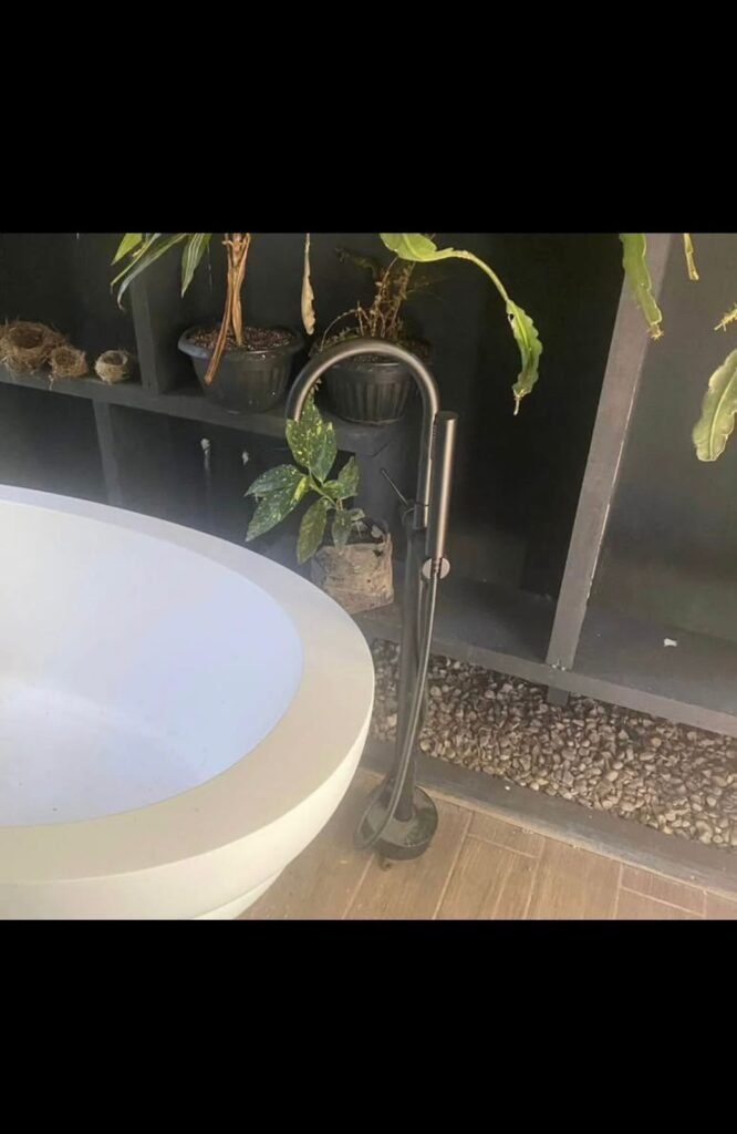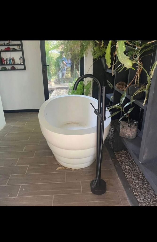 La tina viene acompañada de una grifería negra opaca de diseño, alta y elegante, que combina perfecto con su estética contemporánea.