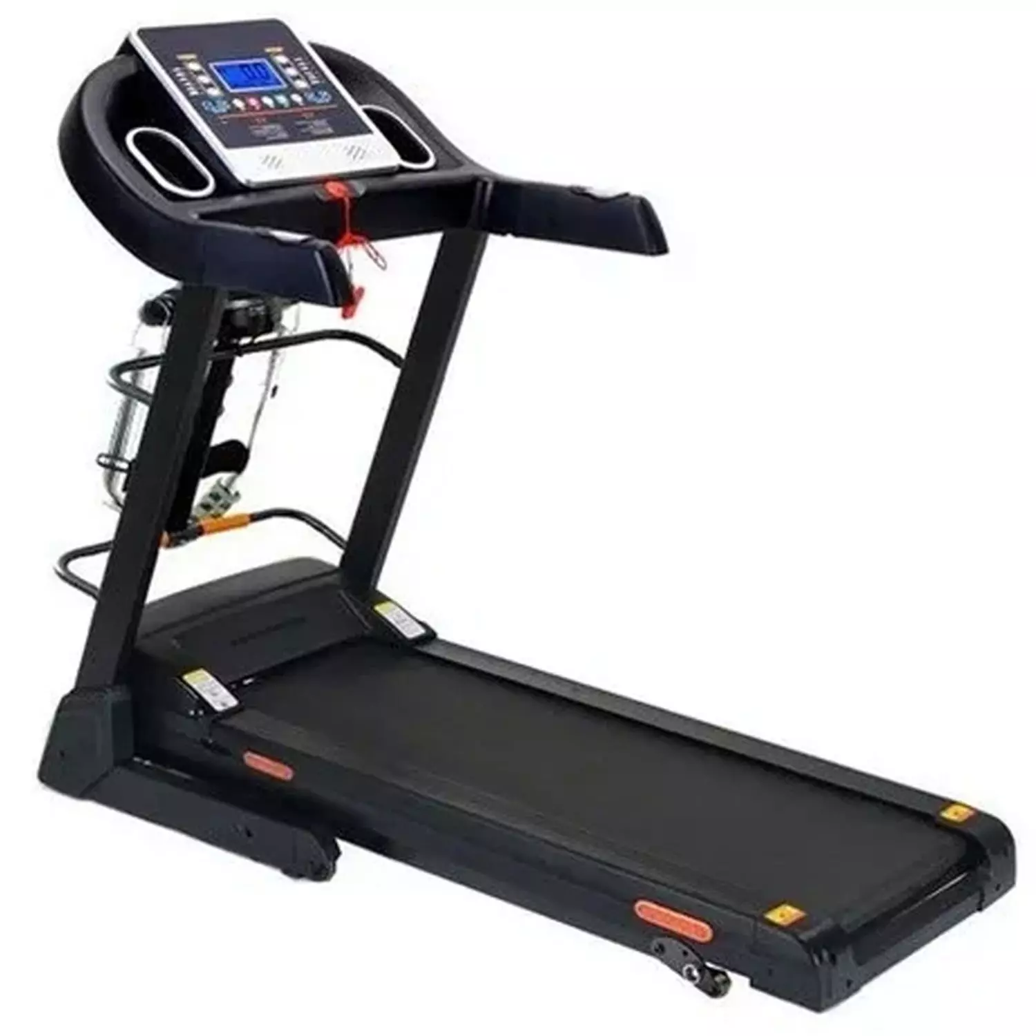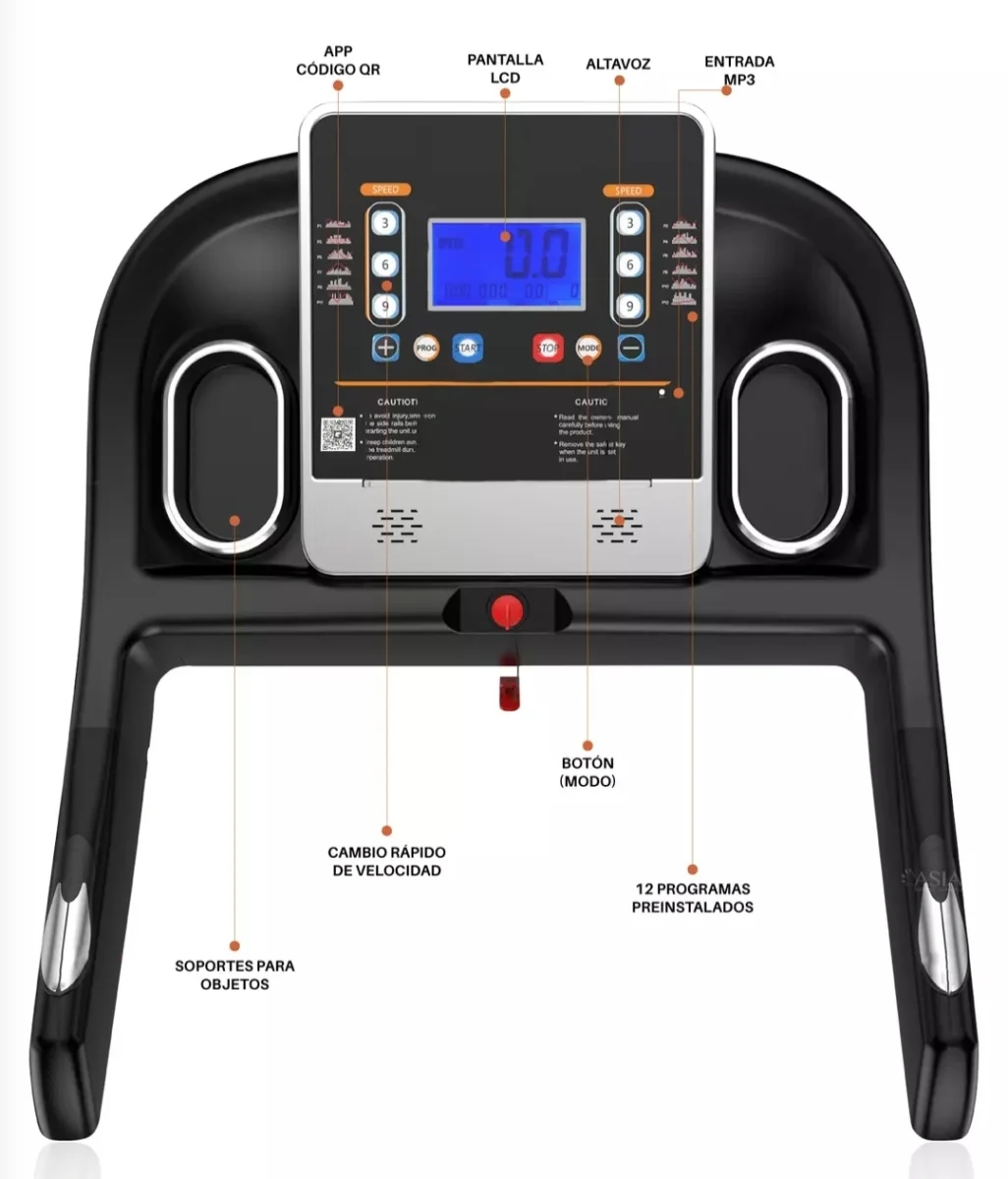 Motor: 2.0HP. • RPM: 4.400. • Rango de velocidad: 1 a 12 km/H. • Panel de control: Pantalla LCD, Tiempo, Velocidad, Distancia, Calorías, Frecuencia cardiaca. • Pulso/ cardio: Sí. • Programa: P1-P12. • Plegable: Sí. • Peso máximo usuario: 120kg. • Aplicación: Uso doméstico. • Tamaño desplegable: 126 x 160 x 70 cm. • Tamaño plegable: 130 x 100 x 70 cm. • Área de trote:120 cm x 40 cm. • Tiempo máximo de uso: 45.0 min. • Distancia: 1km a 99km. • Ruedas: Sí. • Peso del producto: 50kg. • Mecanismo varilla hidráulica: Sí. • Voltaje: 220V±10%. • Frecuencia: 50 / 60 Hz. • Posa vasos: Sí. • Soporte para iPad / celular: Sí. • Incluye: motor masajeador abdominal, glúteos y 2 mancuernas pequeñas, cable mp3, 1 disco de contorsión para cintura.