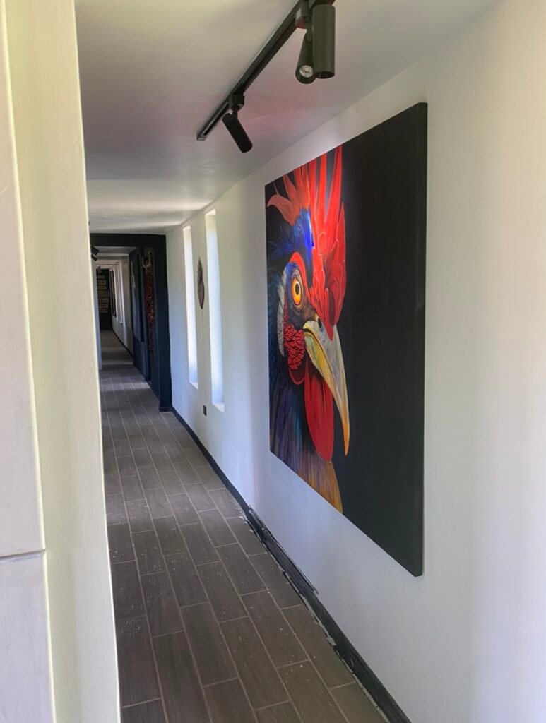 Si buscas un cuadro de gallo para decoración interior, esta pieza de gran formato (150 x 150 cm) es ideal para darle carácter, color y estilo a tu hogar. Es una obra única y exclusiva, trabajada en acrílico y técnicas mixtas, destacando por su presencia visual fuerte y su composición moderna.
